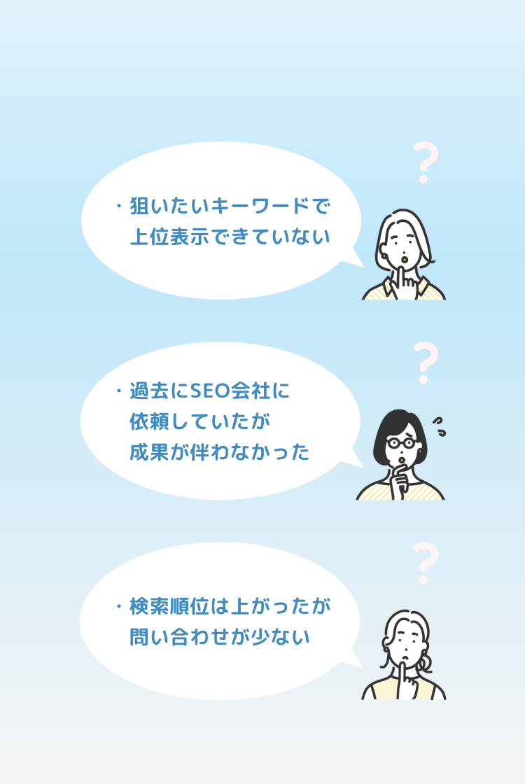 SEO対策を行うにあたり、今あるホームページ上に大幅にコンテンツを増やしていただきました。質のいいコンテンツが増えたことにより、ホームページの検索順位が上がり、お問い合わせが増えています。